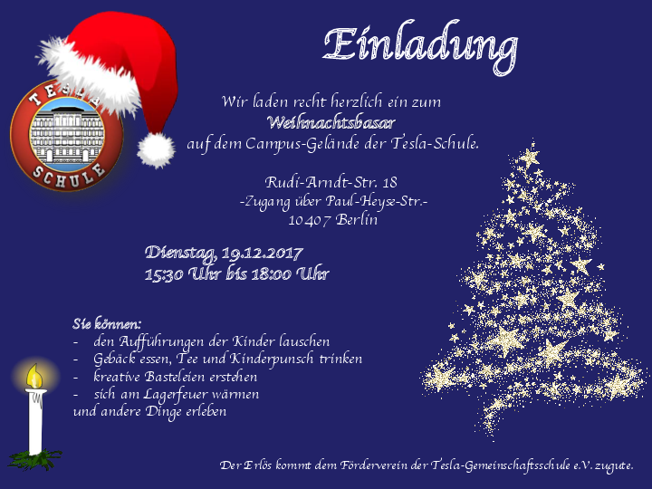 Am Dienstag den 19.12.2017 ist es wieder soweit. Wir veranstalten mit den Kindern, Eltern, Kollegen und Freunden der Tesla-Schule unseren diesjährigen Weihnachtsbasar auf dem Campus Tesla in der Paul-Heyse-Str. Wir starten um 15:30 Uhr mit musikalischen… ... weiterlesen
